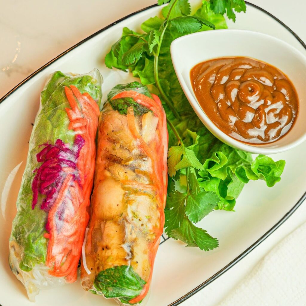 V2. Vermicelles au poulet barbecue et rouleaux impériaux