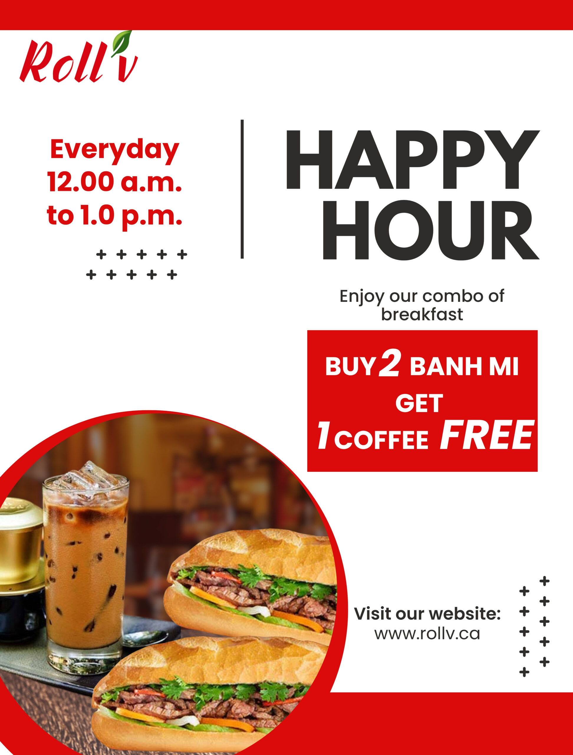 Faites une pause savoureuse à toute heure de la journée avec notre offre spéciale chez Roll’V: Achetez 2 Bánh Mì = 1 Café OFFERT