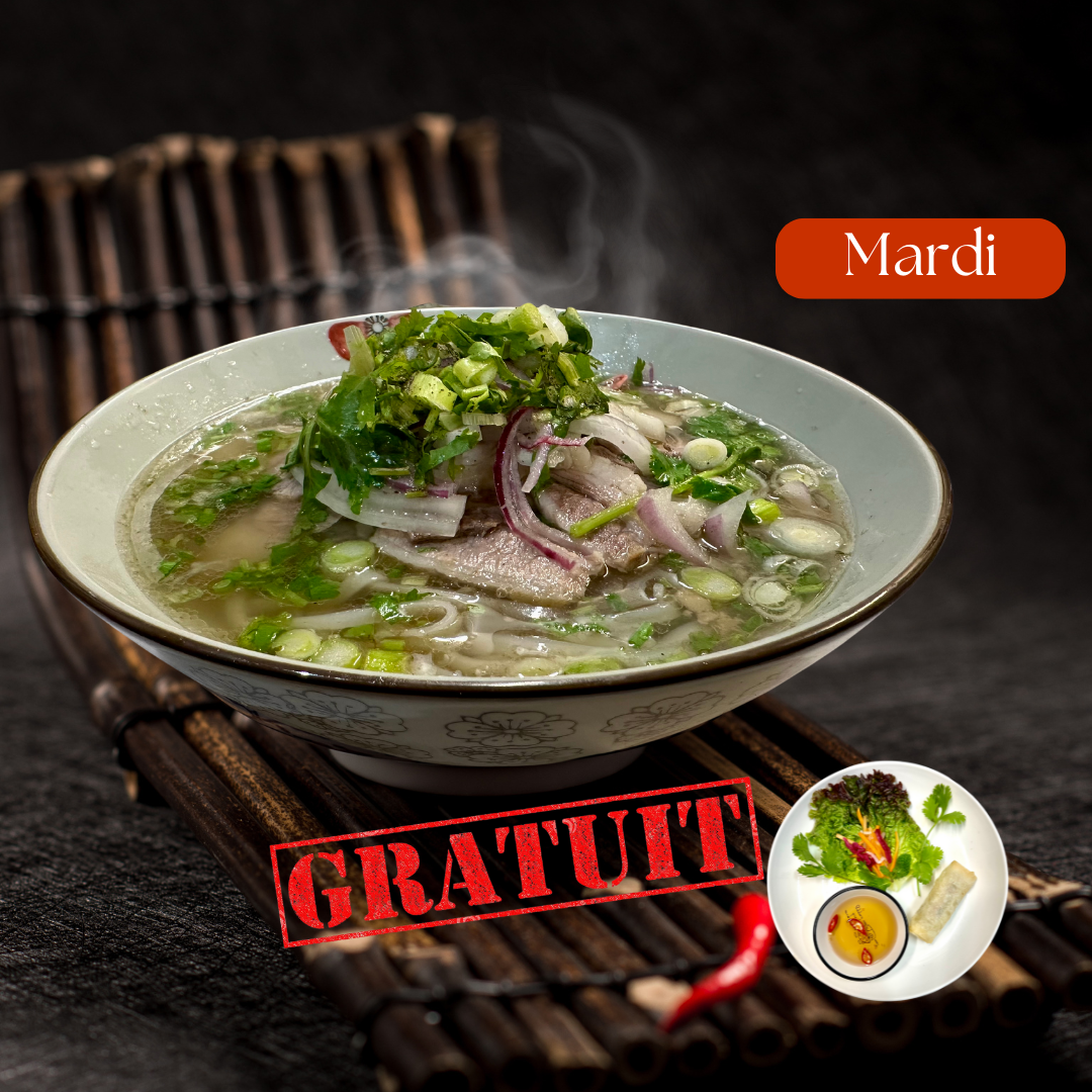 Le mardi, c’est sacré… et surtout délicieux ! Venez célébrer le Pho Day avec nous et profitez d’une offre qui réchauffe le cœur et régale les papilles : Pour le Pho soupe acheté = 1 rouleau impérial OFFERT